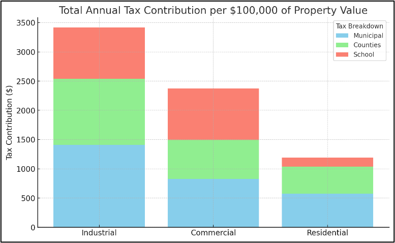 Industrial properties contribute $3,427 per $100,000 in property value, significantly higher than $2,384 for commercial properties and $1,199 for residential properties. This substantial difference underscores how expanding our industrial and commercial sectors can significantly support essential infrastructure improvements and services—such as public safety, recreation, and youth programming—without disproportionately relying on residential taxes.